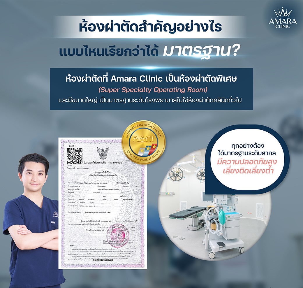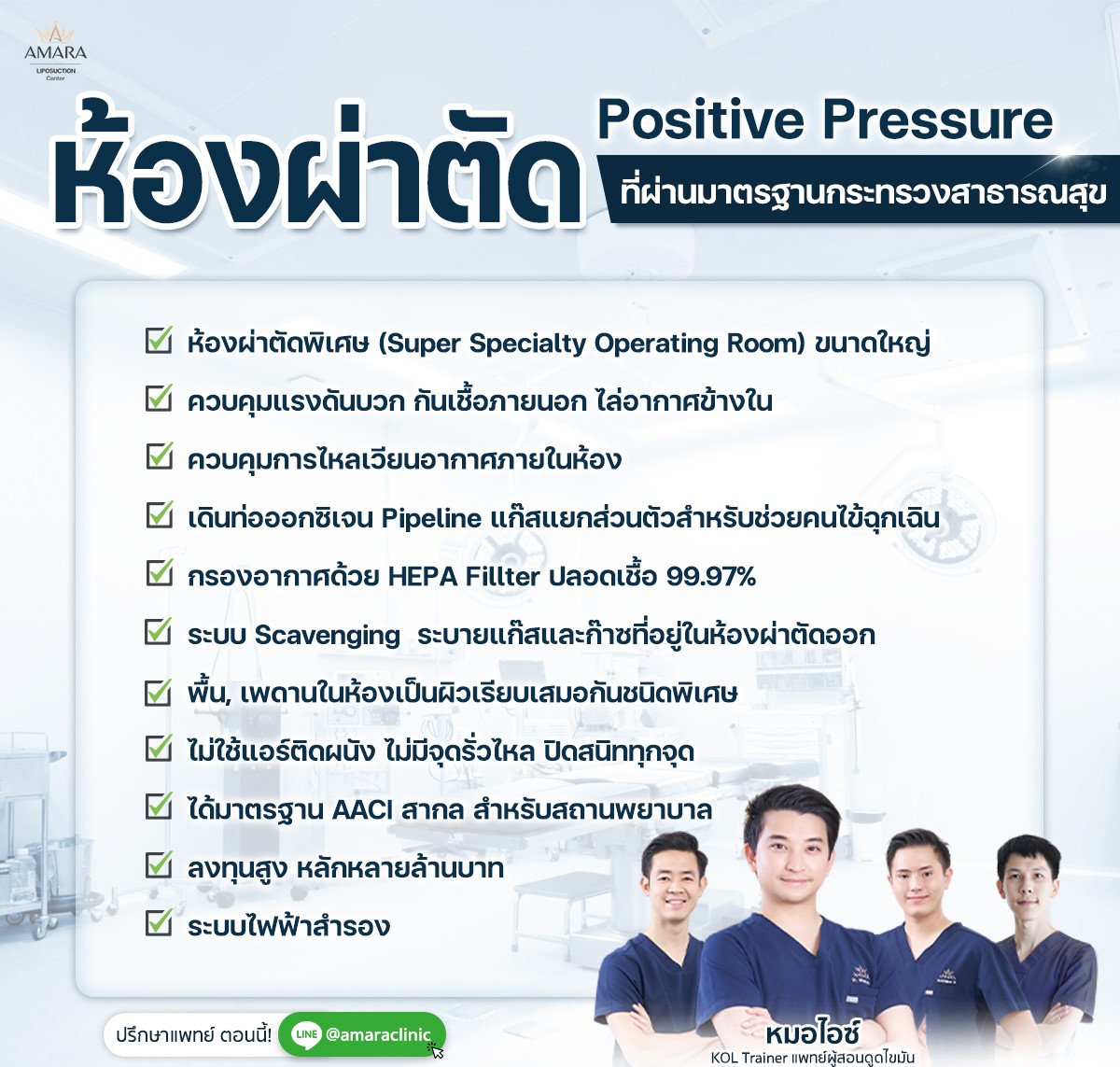 เราจึงสร้างห้องผ่าตัดใหญ่ ระบบ Positive Pressure ที่ผ่านการรับรองจากกระทรวงสาธารณสุข เพื่อให้คุณหมอได้ทำงานในห้องClean Room (ภายใต้มาตรฐาน ISO Class 7) ที่ปลอดเชื้อและมาตรฐานสูง เพราะเราต้องการให้ทุกคนมั่นใจ ในทุกครั้งที่ทำการศัลยกรรมกับเรา